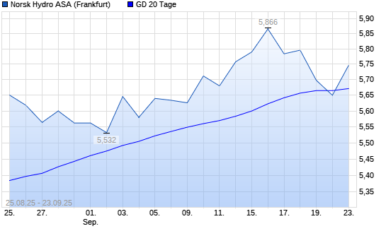 Mit dem Rücksetzer auf 5,65 EUR hat die Norsk Hydro-Aktie am 22.09.2025 die 20-Tage-Linie nach unten gekreuzt.