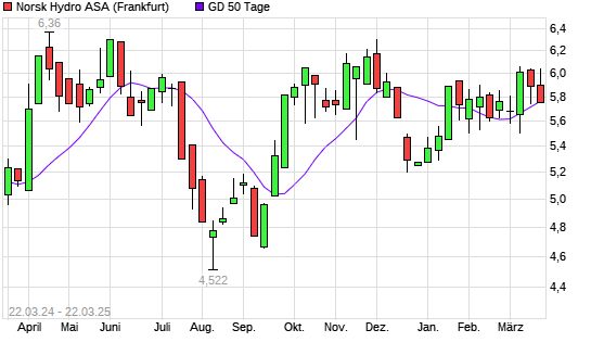Mit dem Rücksetzer auf 5,75 EUR hat die Norsk Hydro-Aktie am 21.03.2025 die 50-Tage-Linie nach unten gekreuzt.