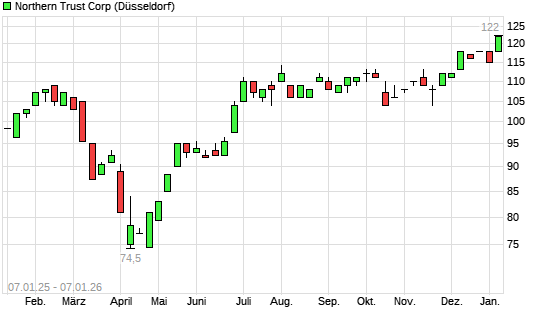 Mit dem Anstieg auf 122,00 EUR hat die Northern Trust-Aktie (ISIN US6658591044) am 06.01.2026 ein neues All-Time-High erreicht und damit den Kurs vom 22.12.2025 eingestellt.