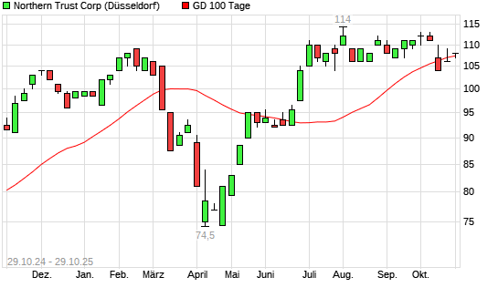 Mit dem Rücksetzer auf 107,00 EUR hat die Northern Trust-Aktie am 28.10.2025 die 100-Tage-Linie nach unten gekreuzt.