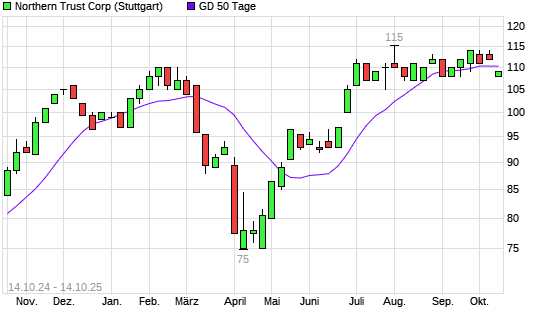 Mit dem Rücksetzer auf 108,00 EUR hat die Northern Trust-Aktie am 13.10.2025 die 50-Tage-Linie nach unten gekreuzt.