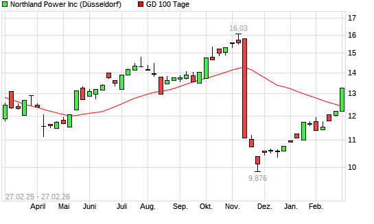 Mit dem Anstieg auf 12,86 EUR hat die Northland Power-Aktie am 26.02.2026 die 100-Tage-Linie nach oben gekreuzt.Die Northland Power-Aktie befindet sich seit dem 13.11.2025 im ...weiterlesen