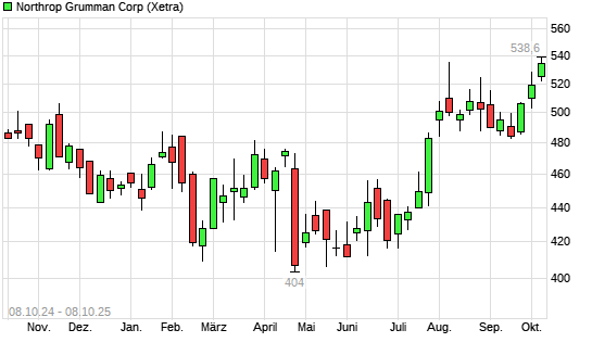 Mit dem Anstieg auf 533,60 EUR hat die Northrop Grumman-Aktie (ISIN US6668071029) am 07.10.2025 ein neues 12-Monats-Hoch erreicht und damit den Kurs vom 06.10.2025 eingestellt.