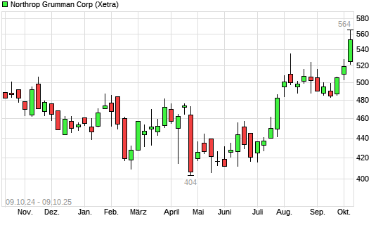Mit dem Anstieg auf 545,80 EUR hat die Northrop Grumman-Aktie (ISIN US6668071029) am 08.10.2025 ein neues 12-Monats-Hoch erreicht und damit den Kurs vom 07.10.2025 eingestellt.