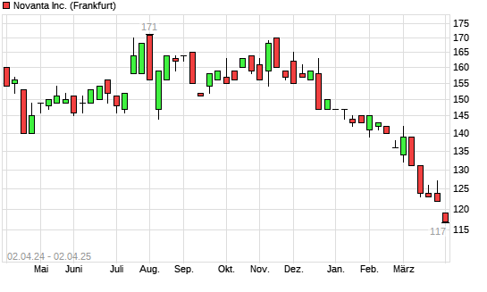 Mit dem Rücksetzer auf 117,00 EUR hat die Novanta-Aktie (ISIN CA67000B1040) am 01.04.2025 ein neues 12-Monats-Tief erreicht und damit den Kurs vom 31.03.2025 eingestellt.