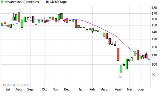 Mit dem Rücksetzer auf 106,00 EUR hat die Novanta-Aktie am 18.06.2025 die 50-Tage-Linie nach unten gekreuzt.Die Novanta-Aktie befindet sich seit dem 19.12.2024 im langfristigen Abwärtstrend ...weiterlesen