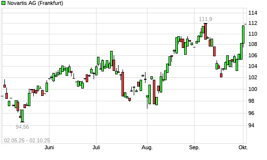 Mit dem Anstieg auf 111,54 EUR hat die Novartis-Aktie (ISIN CH0012005267) am 01.10.2025 ein neues All-Time-High erreicht und damit den Kurs vom 05.09.2025 eingestellt.