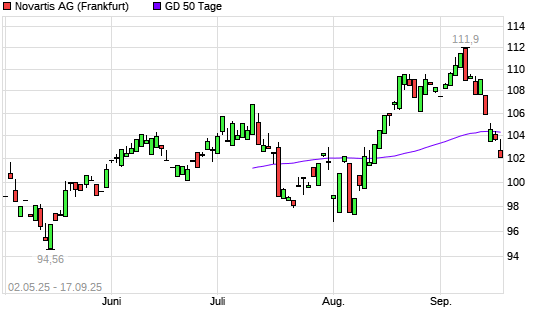 Mit dem Rücksetzer auf 103,68 EUR hat die Novartis-Aktie am 16.09.2025 die 50-Tage-Linie nach unten gekreuzt.