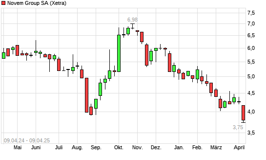 Mit dem Rücksetzer auf 3,83 EUR hat die Novem Group-Aktie (ISIN LU2356314745) am 08.04.2025 ein neues 6-Monats-Tief erreicht und damit den Kurs vom 07.03.2025 eingestellt.