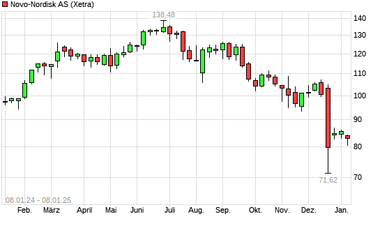 Mit dem Rücksetzer auf 81,34 EUR hat die Novo Nordisk-Aktie (ISIN DK0062498333) am 07.01.2025 ein neues 12-Monats-Tief erreicht und damit den Kurs vom 06.01.2025 eingestellt.