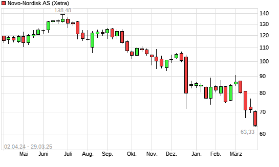 Mit dem Rücksetzer auf 63,30 EUR hat die Novo Nordisk-Aktie (ISIN DK0062498333) am 28.03.2025 ein neues 12-Monats-Tief erreicht und damit den Kurs vom 27.03.2025 eingestellt.