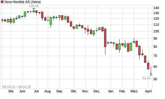 Mit dem Rücksetzer auf 55,57 EUR hat die Novo Nordisk-Aktie (ISIN DK0062498333) am 08.04.2025 ein neues 12-Monats-Tief erreicht und damit den Kurs vom 04.04.2025 eingestellt.
