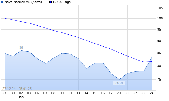 Mit dem Anstieg auf 84,30 EUR hat die Novo Nordisk-Aktie am 24.01.2025 die 20-Tage-Linie nach oben gekreuzt.