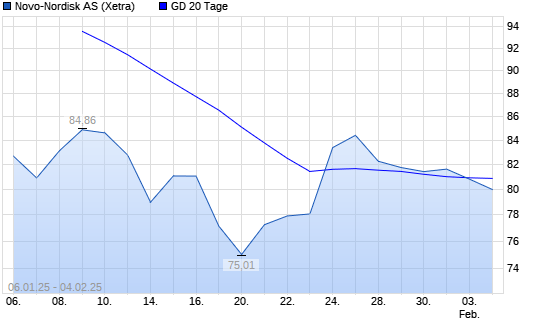 Mit dem Rücksetzer auf 80,80 EUR hat die Novo Nordisk-Aktie am 03.02.2025 die 20-Tage-Linie nach unten gekreuzt.