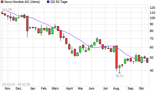Mit dem Rücksetzer auf 46,50 EUR hat die Novo Nordisk-Aktie am 17.10.2025 die 50-Tage-Linie nach unten gekreuzt.