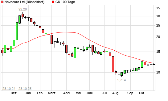 Mit dem Rücksetzer auf 11,57 EUR hat die Novocure-Aktie am 27.10.2025 die 100-Tage-Linie nach unten gekreuzt.