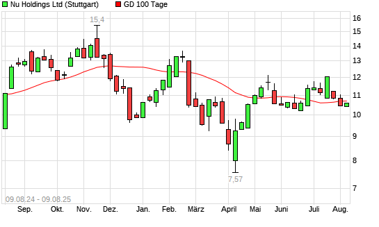 Mit dem Anstieg auf 10,69 EUR hat die Nu Holdings-Aktie am 08.08.2025 die 100-Tage-Linie nach oben gekreuzt.