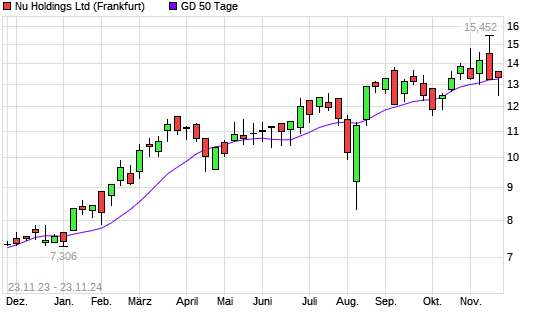 Mit dem Anstieg auf 13,35 EUR hat die Nu Holdings-Aktie am 22.11.2024 die 50-Tage-Linie nach oben gekreuzt.