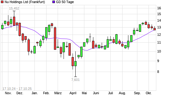 Mit dem Rücksetzer auf 12,60 EUR hat die Nu Holdings-Aktie am 16.10.2025 die 50-Tage-Linie nach unten gekreuzt.