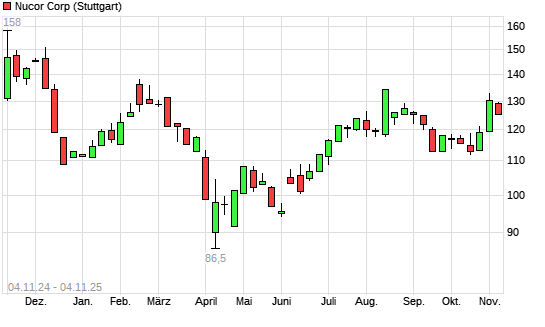 Mit dem Anstieg auf 130,48 EUR hat die Nucor-Aktie (ISIN US6703461052) am 03.11.2025 ein neues 6-Monats-Hoch erreicht und damit den Kurs vom 15.08.2025 eingestellt.