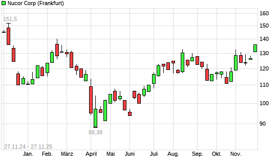 Mit dem Anstieg auf 135,90 EUR hat die Nucor-Aktie (ISIN US6703461052) am 26.11.2025 ein neues 6-Monats-Hoch erreicht und damit den Kurs vom 25.11.2025 eingestellt.