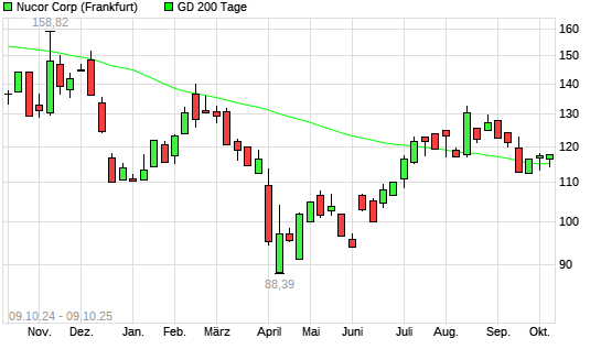 Mit dem Anstieg auf 115,82 EUR hat die Nucor-Aktie am 08.10.2025 die 200-Tage-Linie nach oben gekreuzt.