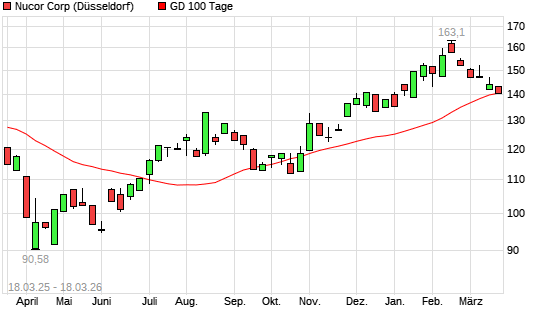 Mit dem Rücksetzer auf 140,04 EUR hat die Nucor-Aktie am 17.03.2026 die 100-Tage-Linie nach unten gekreuzt.