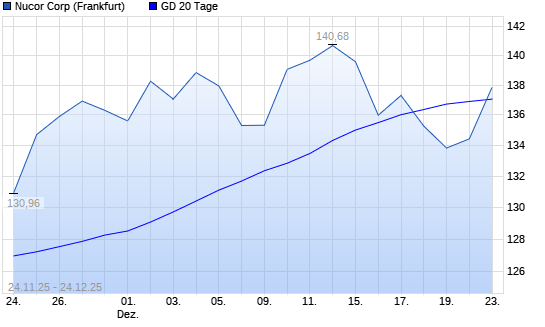 Mit dem Anstieg auf 137,86 EUR hat die Nucor-Aktie am 23.12.2025 die 20-Tage-Linie nach oben gekreuzt.Die Nucor-Aktie befindet sich seit dem 21.10.2025 im langfristigen Aufwärtstrend und hat ...weiterlesen