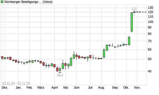 Mit dem Anstieg auf 120,50 EUR hat die Nürnberger Beteiligungs AG-Aktie (ISIN DE0008435967) am 21.11.2025 ein neues 10-Jahres-Hoch erreicht und damit den Kurs vom 24.10.2025 eingestellt.Die ...weiterlesen