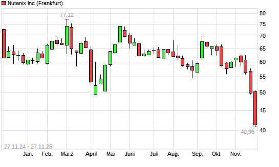 Mit dem Rücksetzer auf 41,95 EUR hat die Nutanix-Aktie (ISIN US67059N1081) am 26.11.2025 ein neues 12-Monats-Tief erreicht und damit den Kurs vom 21.11.2025 eingestellt.