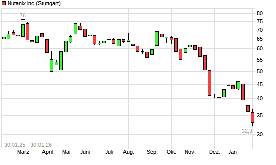Mit dem Rücksetzer auf 32,81 EUR hat die Nutanix-Aktie (ISIN US67059N1081) am 29.01.2026 ein neues 12-Monats-Tief erreicht und damit den Kurs vom 27.01.2026 eingestellt.