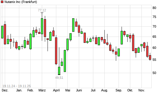 Mit dem Rücksetzer auf 55,22 EUR hat die Nutanix-Aktie (ISIN US67059N1081) am 18.11.2025 ein neues 6-Monats-Tief erreicht und damit den Kurs vom 17.11.2025 eingestellt.