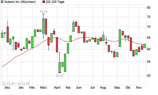 Mit dem Anstieg auf 62,48 EUR hat die Nutanix-Aktie am 10.11.2025 die 100-Tage-Linie nach oben gekreuzt.