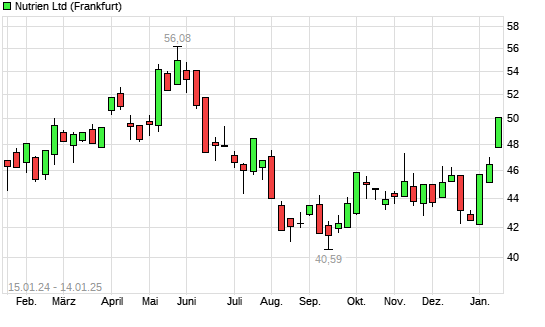 Mit dem Anstieg auf 49,76 EUR hat die Nutrien-Aktie (ISIN CA67077M1086) am 13.01.2025 ein neues 6-Monats-Hoch erreicht und damit den Kurs vom 17.07.2024 eingestellt.