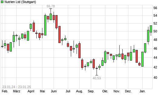 Mit dem Anstieg auf 51,28 EUR hat die Nutrien-Aktie (ISIN CA67077M1086) am 22.01.2025 ein neues 6-Monats-Hoch erreicht und damit den Kurs vom 15.01.2025 eingestellt.