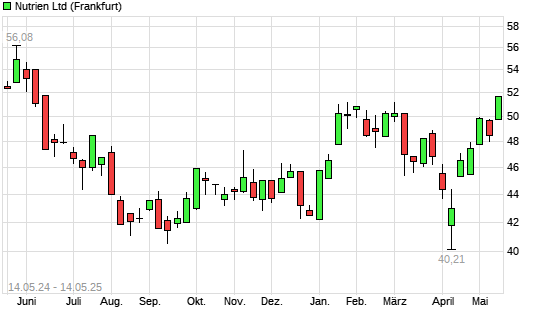 Mit dem Anstieg auf 51,74 EUR hat die Nutrien-Aktie (ISIN CA67077M1086) am 13.05.2025 ein neues 6-Monats-Hoch erreicht und damit den Kurs vom 23.01.2025 eingestellt.