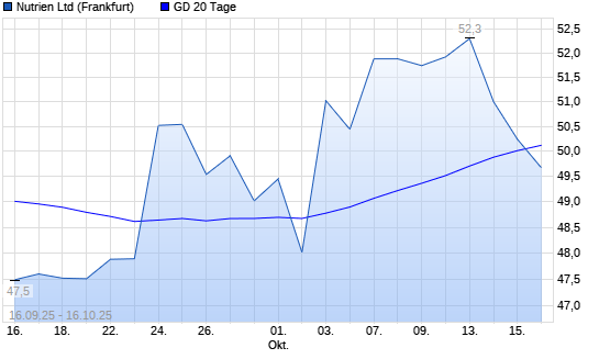 Mit dem Rücksetzer auf 49,67 EUR hat die Nutrien-Aktie am 15.10.2025 die 20-Tage-Linie nach unten gekreuzt.