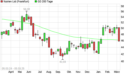Mit dem Rücksetzer auf 45,71 EUR hat die Nutrien-Aktie am 04.03.2025 die 200-Tage-Linie nach unten gekreuzt.