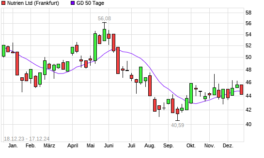Mit dem Rücksetzer auf 44,55 EUR hat die Nutrien-Aktie am 16.12.2024 die 50-Tage-Linie nach unten gekreuzt.