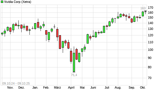 Mit dem Anstieg auf 162,06 EUR hat die Nvidia-Aktie (ISIN US67066G1040) am 08.10.2025 ein neues All-Time-High erreicht und damit den Kurs vom 02.10.2025 eingestellt.