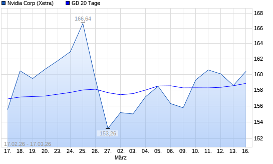 Mit dem Anstieg auf 158,74 EUR hat die Nvidia-Aktie am 16.03.2026 die 20-Tage-Linie nach oben gekreuzt.