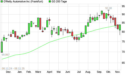 Mit dem Anstieg auf 84,02 EUR hat die O'Reilly Automotive-Aktie am 07.11.2025 die 200-Tage-Linie nach oben gekreuzt.