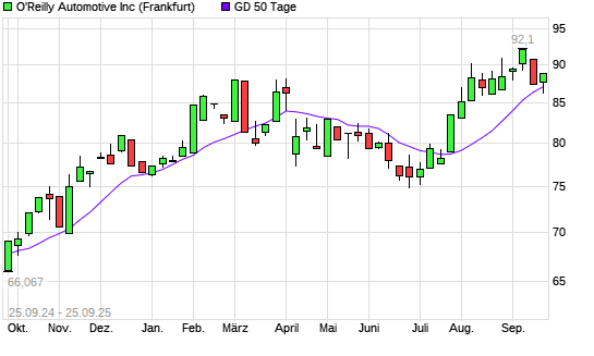 Mit dem Anstieg auf 88,08 EUR hat die O'Reilly Automotive-Aktie am 24.09.2025 die 50-Tage-Linie nach oben gekreuzt.