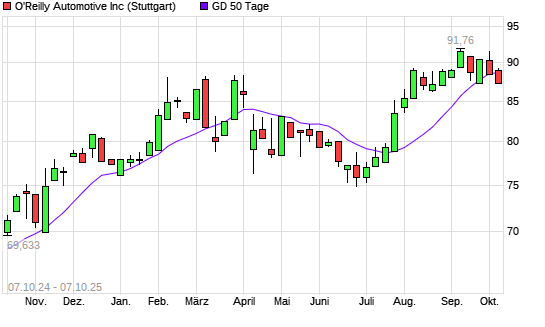Mit dem Rücksetzer auf 88,06 EUR hat die O'Reilly Automotive-Aktie am 06.10.2025 die 50-Tage-Linie nach unten gekreuzt.