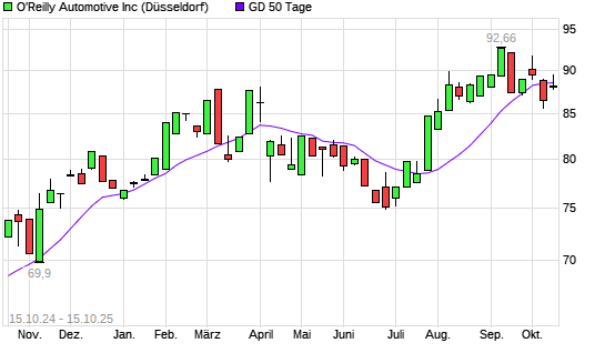 Mit dem Rücksetzer auf 88,46 EUR hat die O'Reilly Automotive-Aktie am 14.10.2025 die 50-Tage-Linie nach unten gekreuzt.