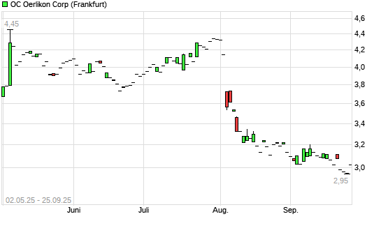 Mit dem Rücksetzer auf 2,95 EUR hat die OC Oerlikon-Aktie (ISIN CH0000816824) am 24.09.2025 ein neues 10-Jahres-Tief erreicht und damit den Kurs vom 23.09.2025 eingestellt.