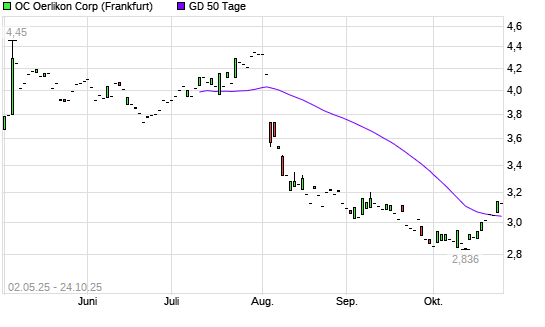 Mit dem Anstieg auf 3,14 EUR hat die OC Oerlikon-Aktie am 23.10.2025 die 50-Tage-Linie nach oben gekreuzt.