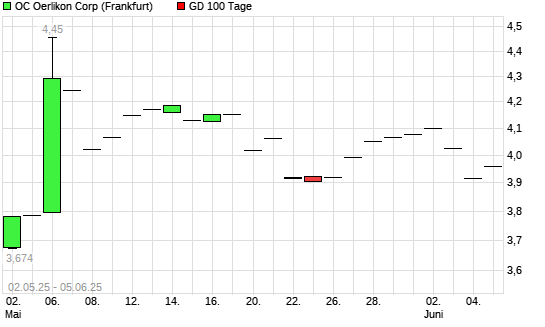 Mit dem Rücksetzer auf 3,92 EUR hat die OC Oerlikon-Aktie am 04.06.2025 die 100-Tage-Linie nach unten gekreuzt.