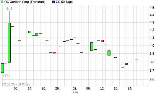 Mit dem Rücksetzer auf 3,90 EUR hat die OC Oerlikon-Aktie am 30.06.2025 die 50-Tage-Linie nach unten gekreuzt.