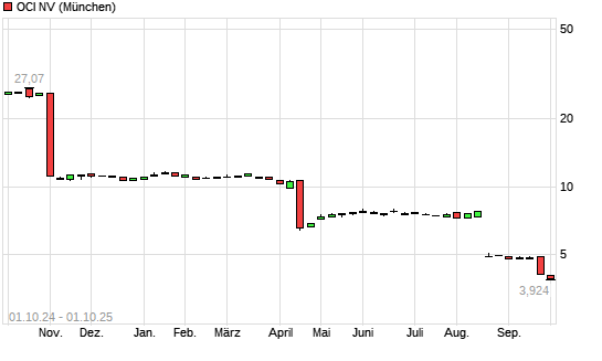 Mit dem Rücksetzer auf 3,94 EUR hat die OCI-Aktie (ISIN NL0010558797) am 30.09.2025 ein neues All-Time-Low erreicht und damit den Kurs vom 26.09.2025 eingestellt.